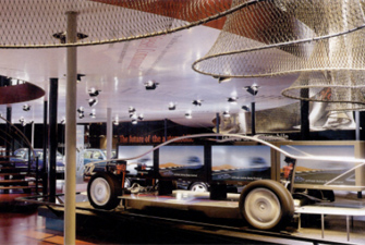該展場(chǎng)是奔馳公司為在巴塞羅那舉行的展會(huì)而設(shè)計(jì)的,其設(shè)計(jì)理念主要源自劇場(chǎng)空間的序列,即以刷院門(mén)廳為起始,終結(jié)于劇場(chǎng)大廳。展場(chǎng)空間依循此理念,將展示空聞全部展示給參觀者,而不是用封閉的墻或門(mén)將展示空間分隔成許多零碎的小空間。而開(kāi)放的展示空間在全部呈現(xiàn)給觀眾的同時(shí),也顯示出各個(gè)空間的個(gè)性來(lái)。
