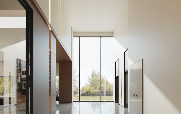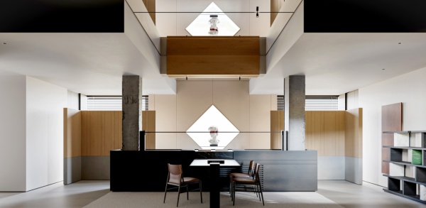 入口以黑色大理石與幾何空間結構為核心設計元素,營造出現代、沉穩且富有藝術張力的視覺體驗。木紋開放柜采用原木色系柜體框架,通過橫向延展的線條強化空間的視覺張力。
