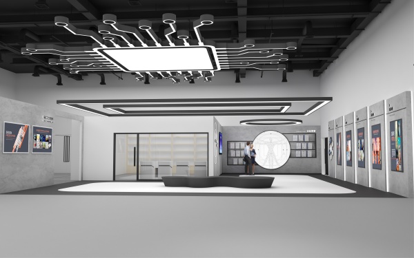 每個空間的輻射半徑是有限的,那如何在有限的空間中展現出主題的內容,我們需要找尋在空間的視覺中心,并且在視覺中心中衍生交互展示的概念拓展。這次我們收到的委托命題,基于企業需求,我們決定用藍色來闡述這個空間。用顏色來闡述企業的辨識度,以簡約的設計體塊去表達空間為企業展廳賦予全新的生命力。